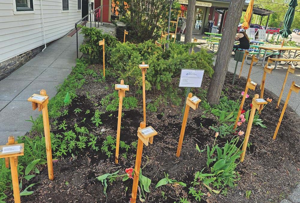 CEDAR MARKING SIGNS made by Shoreham woodworker Dick Phillip mark the new pollinator-friendly plants being installed in the Middlebury Natural Foods Co-op gardens this month.