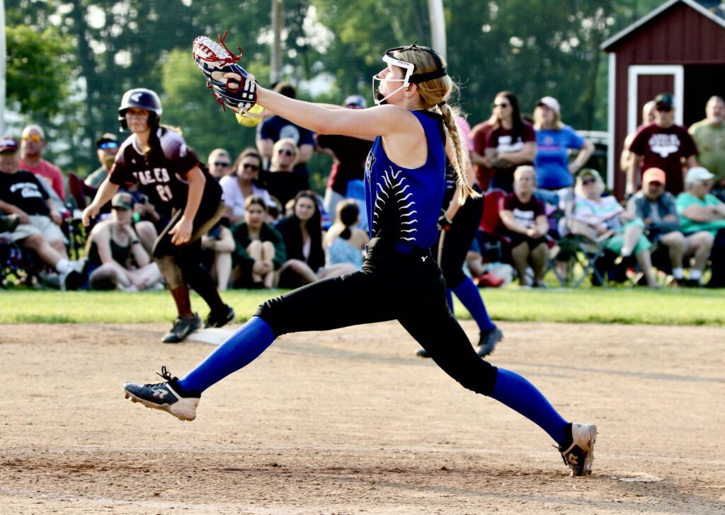EAGLE JUNIOR GRETCHEN Toy tossed a complete-game on Wednesday, June 11, over Otter Valley in the No. 2 Mount Abe softball team’s semifinal win over No. 3 Otter Valley, and she also homered.