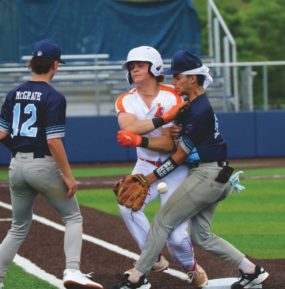 AC’S TUCKER WRIGHT collides with South Burlington first baseman Mateo Ortiz on a close play in Tuesday night’s American Legion game in Middlebury. He was called out on the play.