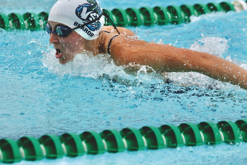 CHAMP ELLA BEAROR battles to a second-place finish in the 15-18 girls’ 50-yard butterfly race in the Vergennes city pool on Tuesday.