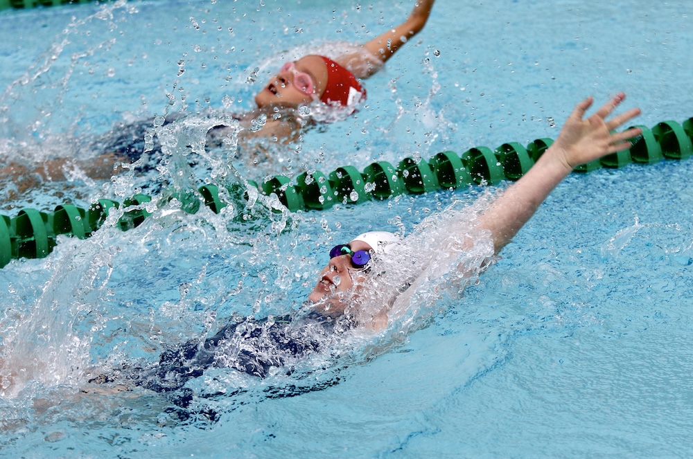 CHAMP KENDALL MATTON (front) runs neck-and-neck with a Burlington Tennis Club swimmer in the 9-10 girls’ backstroke race in the Vergennes city pool on Tuesday.