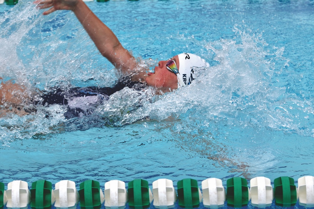 CHAMP ZOEY KRESS swims to victory in the girls’ age 9-10 25-yard backstroke race in the Vergennes city pool on Tuesday.