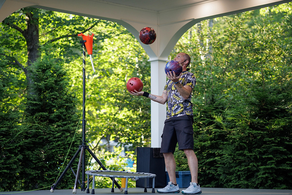 JASON TARDY, WHO entertains by juggling bowling balls, will be among the performers at the Festival on the Green’s Brown Bag lunch programs on the Middlebury town green July 13-19.