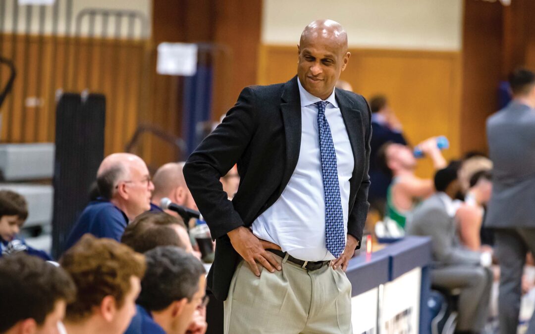 MIDDLEBURY MEN’S BASKETBALL coach Jeff Brown, recently retired, huddles with his team in 2023. One of his NESCAC coaching rivals, Joe Reilly of Wesleyan, called Jeff “one of the top coaches in all of college basketball — any level, and his influence with be missed in the NESCAC, D3 basketball and beyond.”