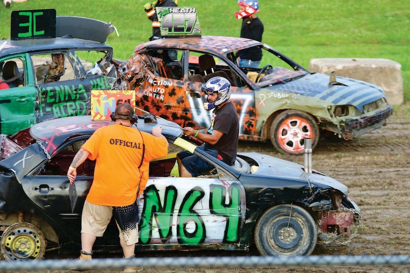 A DEMO DERBY official makes a ruling amidst a scrum of vehicles during Tuesday evening’s action at Addison County Fair & Field Days.