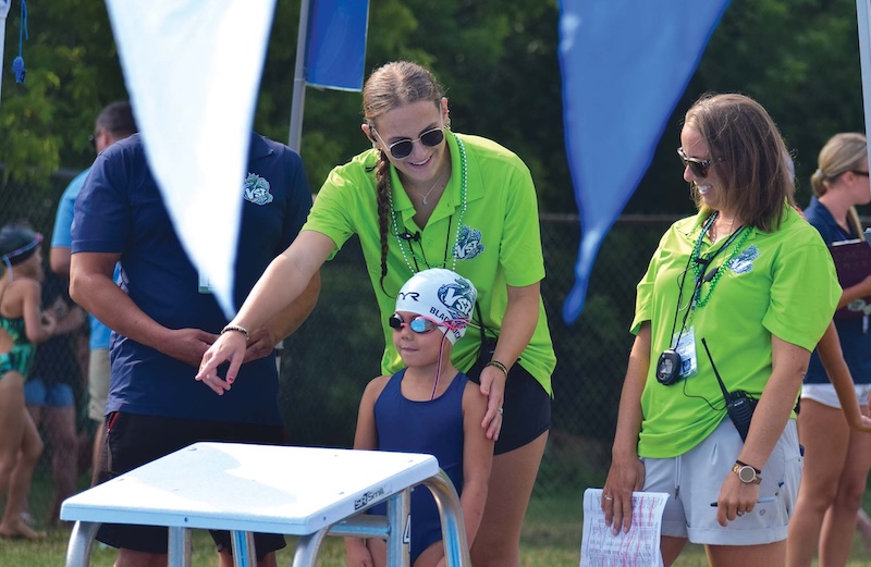 HARPER BLACKLOCK, ONE of VST’s youngest swimmers, stands behind the blocks before her race on Saturday. Her coaches, Cherise Woods and Adrienne Smits, offer the five-year-old encouragement and pre-race advice.