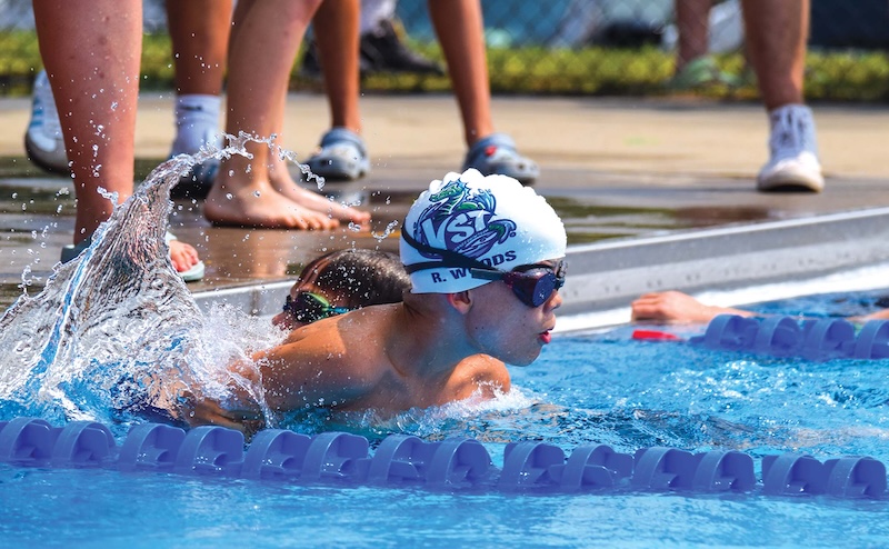 Leading the way with three individual wins in the 18-and-under boys’ 100 individual medley, 50 breaststroke and 50 freestyle was VST swimmer Will Clark, who scored 48 points for the Champs.