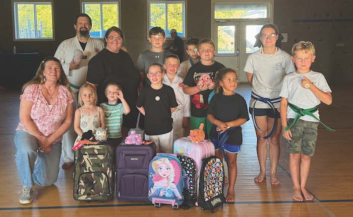 TAEKWON DO KICKS, led by Master Kellie Thomas, recently awarded grants to causes in Addison County, including folks served by the Middlebury Department for Children & Families (pictured here, along with some members of Taekwon Do KICKS). The taekwondo club periodically conducts break-a-thons (of wooden boards) to raise the money that it gives away.