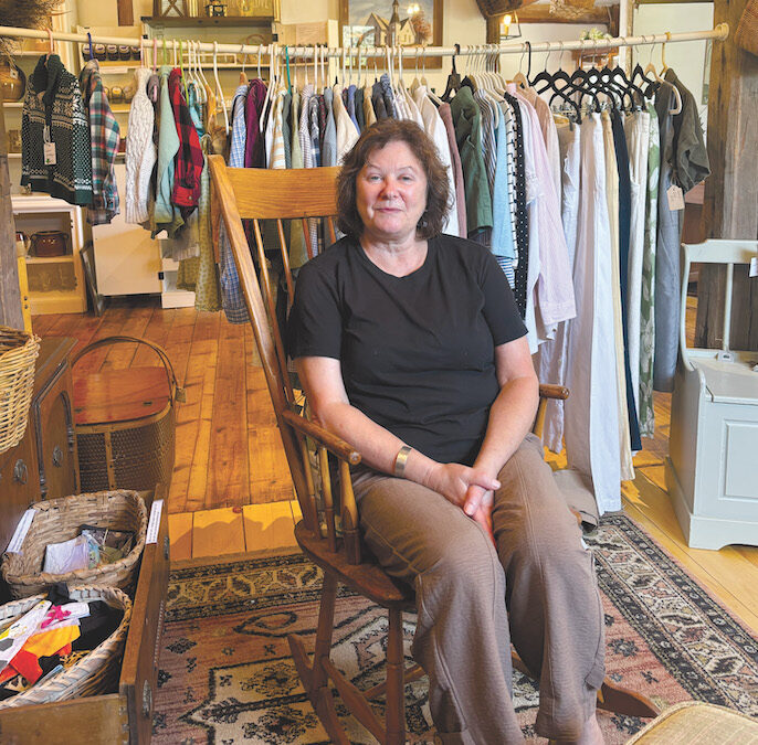OWNER LIZ MCGURK sits surrounded by handcrafted works at her artisan marketplace, Three Pines Treasures, 7718 Route 22A in Addison. The shop is open Thursday–Saturday, 10 a.m.–5 p.m., and Sunday, 11 a.m.–4 p.m., inviting visitors to discover a treasure of their own.