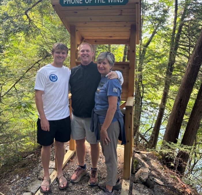 FROM LEFT, GREG, Bruce and Tracy Wilhelm stand in front of the Phone of the Wind that they installed in Wright Park along the Trail Around Middlebury this July. Created in memory of their eldest brother and son, Luke Wilhelm, who died in a climbing accident at age 26 in March 2022, the Wind Phone is an unconnected rotary phone where visitors can “call” deceased loved ones and send their words into the breeze.