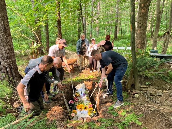 The Vermont Forest Cemetery, founded in October of 2023, is sited on 56 acres of mixed hardwood forest in the Green Mountains above Roxbury, Vermont. The cemetery encourages families and friends to participate directly in the burial process, if they wish, allowing them to perform a final act of love for their loved one that helps deal with the grief of loss and with saying goodbye.