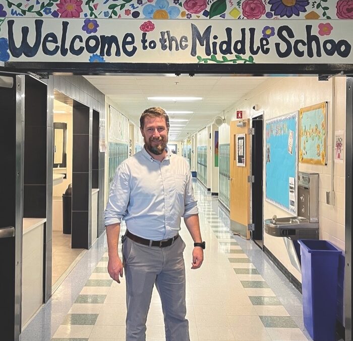 VERGENNES UNION MIDDLE School Principal Colden Golann stands under the banner that welcomes students, staff and visitors to the middle school wing of the building that it shares with Vergennes Union High School. Golann was one of many who helped make the introduction of 6th grade to the ANWSD middle school starting in the fall of 2024 a success.