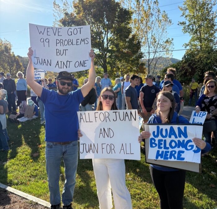 SIGN-HOLDING SUPPORTERS of Panton’s Juan De La Cruz showed up in force at the St. Albans ICE headquarters on Tuesday to urge federal authorities to allow the Mexican national to remain in the U.S. De La Cruz is employed, has lived in the U.S. for 20 years, and is married to a local woman with whom he has two children.