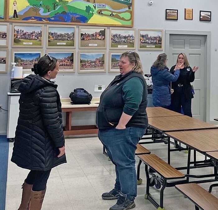 FIRST- AND SECOND-GRADE teacher Brenna Kimball, left, and school board chair Laurie Bertrand discuss the future of the school after a meeting in the Leicester school building on Saturday.