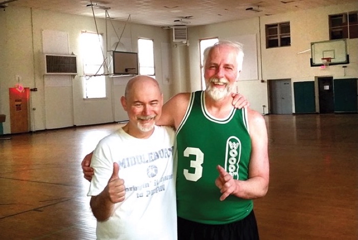 ANDY KIRKALDY TAKES a break in the old Middlebury Municipal Gym with his pal the late Pete Quinn, a local basketball guru who coached both the Vergennes High girls’ and boys’ basketball teams. Andy and Pete were teammates on Woody’s Restaurant teams in the adult men’s league team.