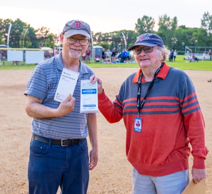 INDEPENDENT SPORTS REPORTER Andy Kirkaldy jokes with his alter ego from Rutland, longtime Rutland Herald sports reporter Tom Haley, and compares notes at a Mount Abraham Union High School softball playoff game this past June.