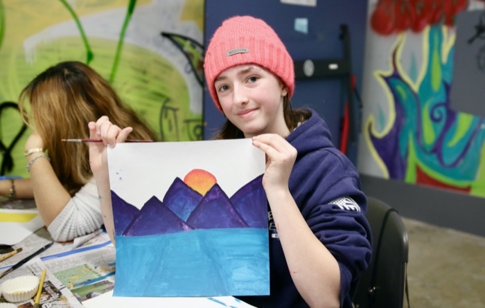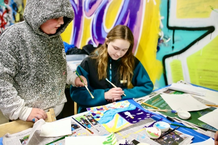 WILLOW HOSANNA, A ninth-grader at Middlebury Union High School, paints a panel for the Middlebury Skatepark- Community Mural Project during a DREAM gathering at Middlebury College this past Friday.
