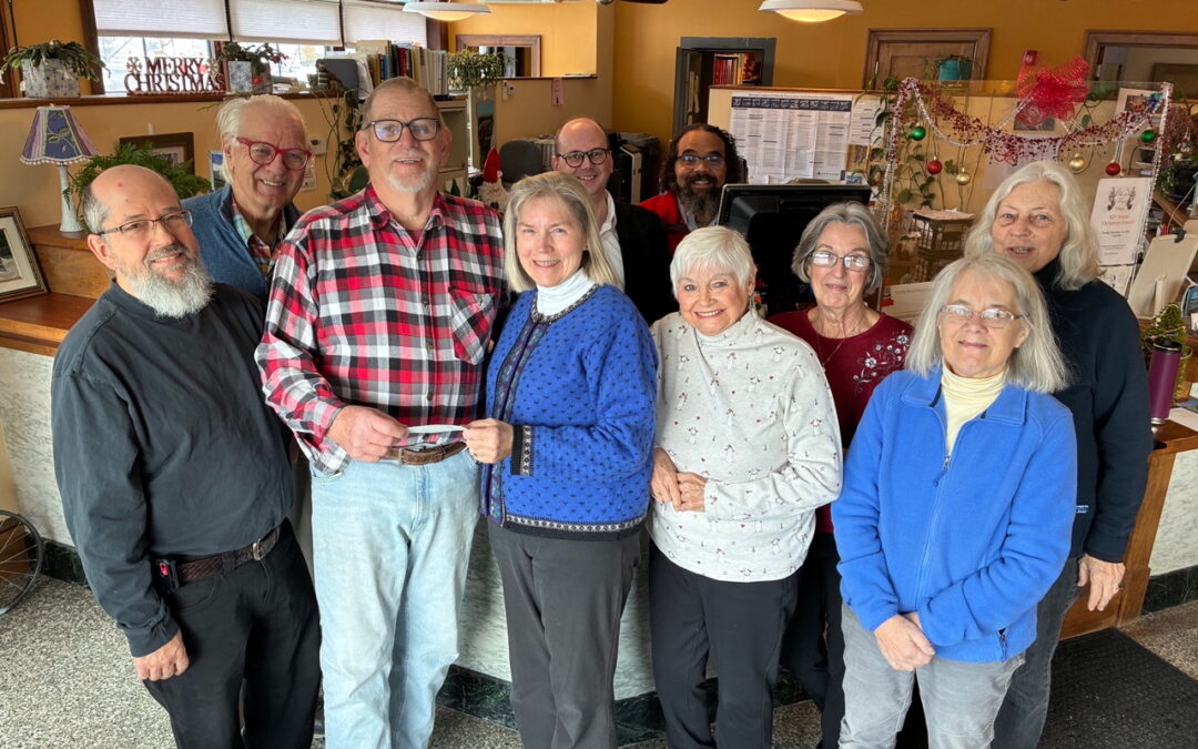 BRANDON TOWN OFFICIALS and Nifty Thrifty volunteers celebrate Nifty Thrifty’s $50,000 gift of solar power to the town on Dec. 12. Pictured at the town office, from left, are front row: Brandon Energy Committee members David Martin and Joyous Emerson; Brandon Selectboard Chair Doug Bailey; Nifty Thrifty representatives Laura Peterson, Dorothy Bird, Leanne Tyminski, Melly Flynn and Lynn Wilson; and back row: Town Manager Seth Hopkins and Community Development Director Bill Moore.
