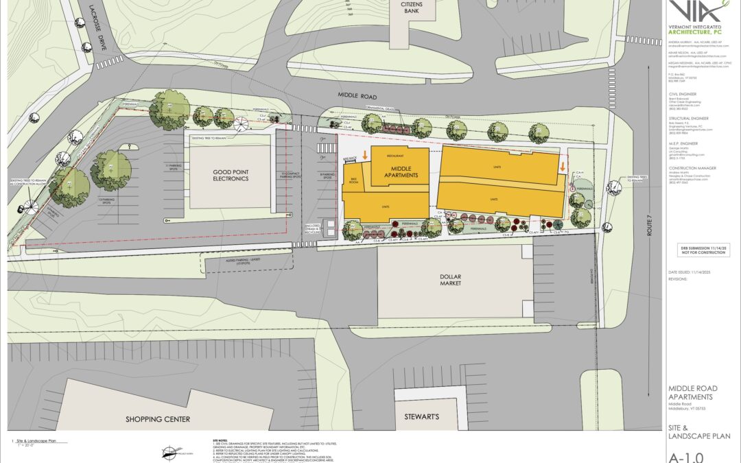 The Middlebury Development Review Board (DRB) has approved a 35-unit, four-story apartment building — that will also host a restaurant — on a 0.71-acre lot near the intersection of Middle Road and Route 7 South.