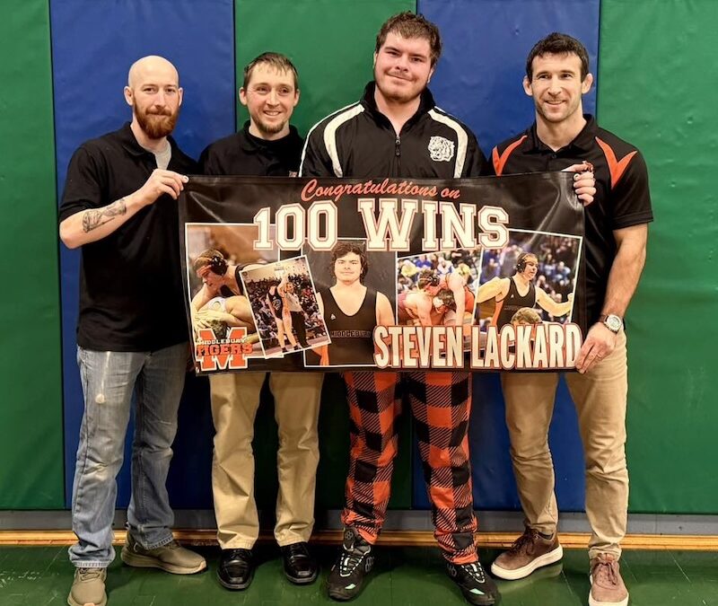 TIGER STEVEN LACKARD celebrates with his coaches after the MUHS senior earned his 100th career victory at a double-dual meet in Colchester last week.