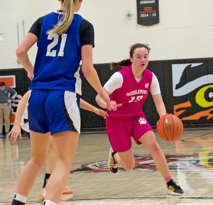 MUHS SOPHOMORE CO-CAPTAIN Louisa Orten dribbles toward the Commodore hoop during Monday’s home game against VUHS. Orten exploded for 28 points, making her the game’s highest scorer, and helping get the Tigers a 48-45 victory over the Commodores.