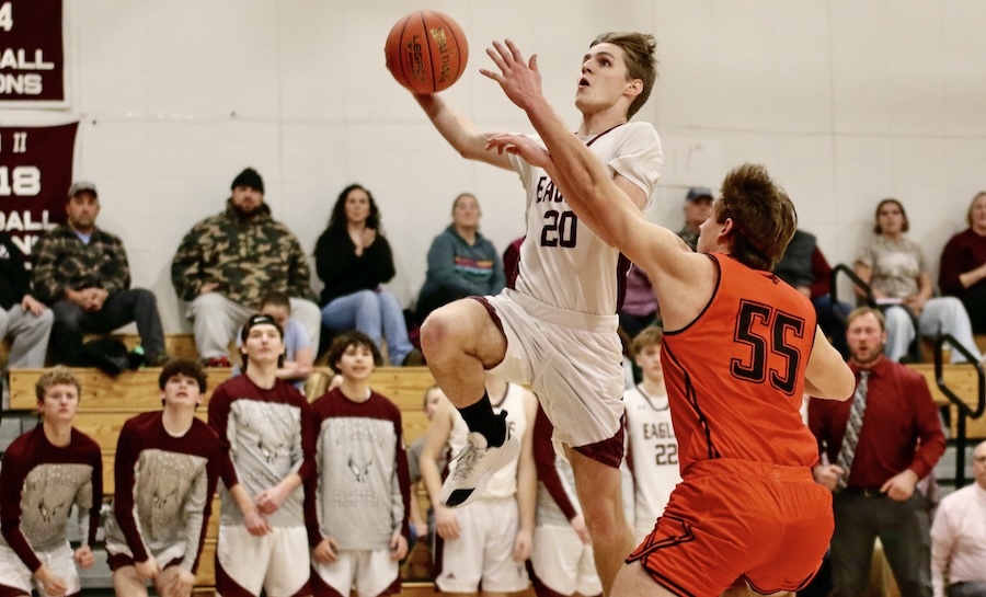 EAGLE JOHN STANLEY goes in for a layup during Friday’s home game against MUHS. Stanley put up four points that night. Independent photo/Steve James