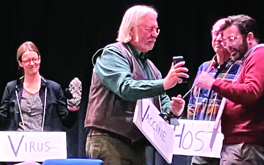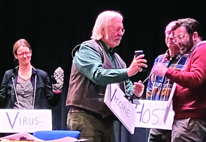 LOCAL MEDICAL PROFESSIONALS Abigail Wikoff, left, George Fjeld, David Schneider and Ben Bearnot play a little skit at Brandon Town Hall this past Thursday to portray the effectiveness of vaccines in public health.