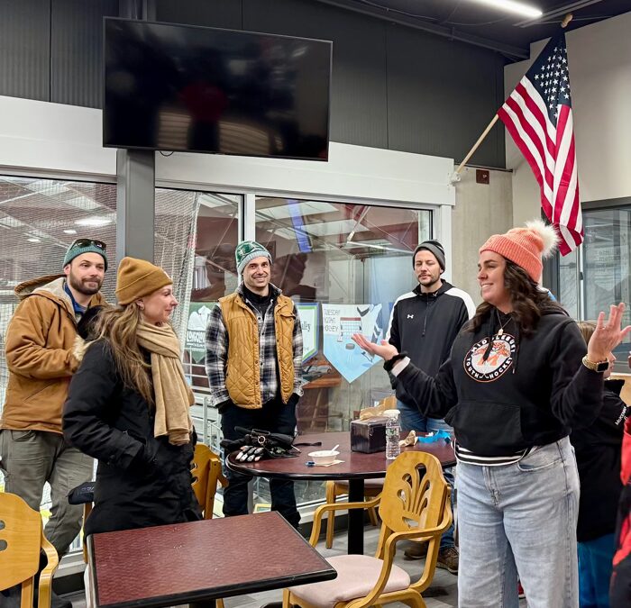 MICHELLE PERINNE (PINK hat) expresses words of gratitude during a Feb. 1 fundraiser at Middlebury’s Memorial Sports Center that benefitted the Perinne family. Michelle’s husband, Pieter, is recovering from injuries sustained in an ATV accident, and the Middlebury hockey community has rallied around the family during its time of need. Photo/courtesy of Brit McKenna
