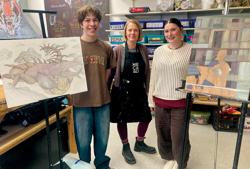 Advanced art students Tristan Baucom (left) and Sawyer Cash Witscher (right) stand with Visual Arts teacher Kylie Wolgamott (center) in the art studio at Middlebury Union High School. Together with senior Spencer Copeland and others, these students will present an art show at Jackson Gallery in Middlebury, from March 18-27.