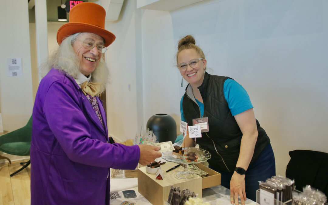“WILLY WONKA,” WHO made an appearance at Sunday’s Vermont Chocolate Festival in Middlebury’s Town Hall Theater, couldn’t resist the sweets made by Dawn Wagner of Daily Chocolate of Vergennes. Organizers called the festival a phenomenal success. See more on Page 17A.