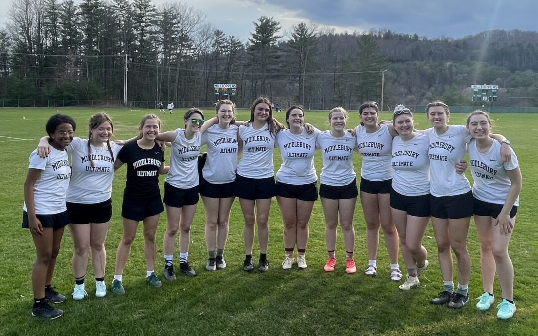 THE MIDDLEBURY UNION High School girls’ ultimate team poses for a picture after a big 10-8 road win over St. Johnsbury on Thursday, April 16. From left are Mia Miranda-Ngaiza, Julie Connolly, Nataly Johnson, Oprea Littlefield, Kennady Renninger, Ana Sansone, Greta Suter, Lila Hescock, Mira Biancosino, Adalaide Markowski, Avery Hohenschau and Eve Menguc.