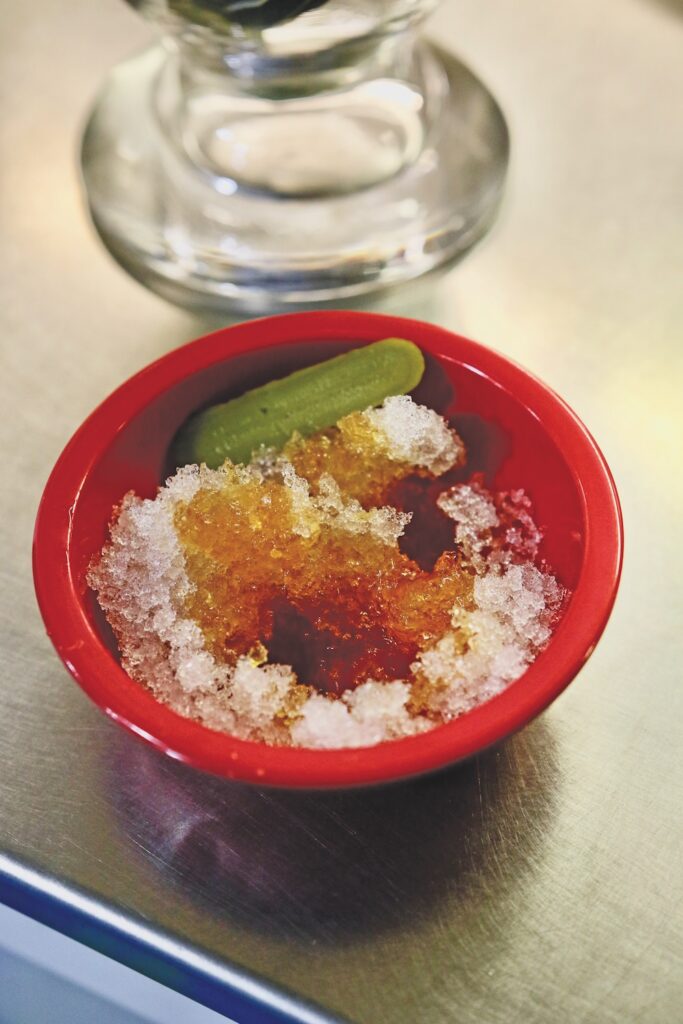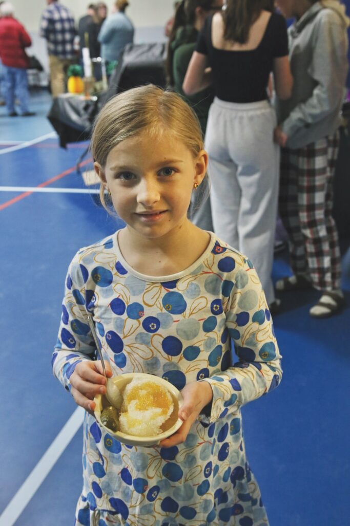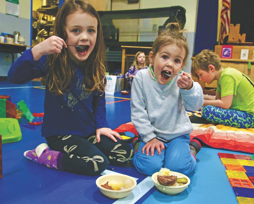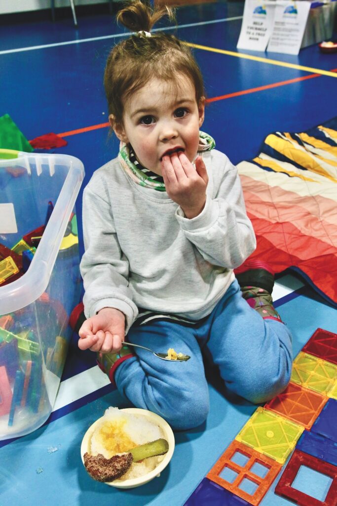 - FIVE-YEAR-OLD Harper Baxter and her two-year-old sister, Blaire, scoop up maple syrup on shaved ice at Starksboro’s sugar-on-snow party and chili fest this past Saturday. The girls have more syrup and homemade doughnuts in reserve. Independent photo/Steve James