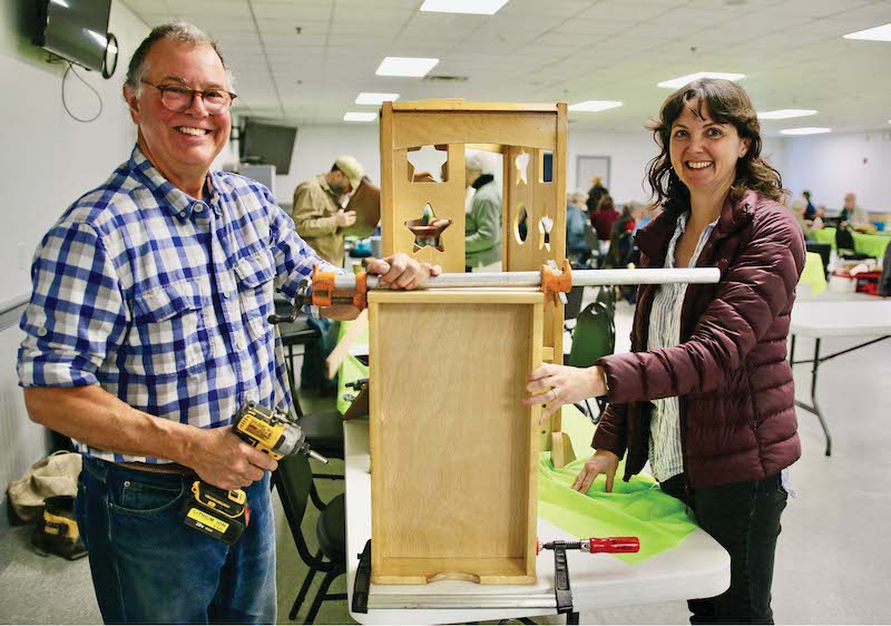 - AT SATURDAY’S REPAIR Fair in the American Legion hall off Boardman Street in Middlebury, Kerri-Ann Jennings of Vergennes is clearly pleased that volunteer Dan Rossignol of Addison was able to fix the learning tree her son used to stand on to watch her cooking. Independent photo/Steve James