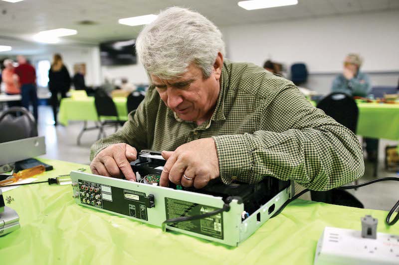- THE ADDISON COUNTY Solid Waste Management District hosted its “Repair Fair” this past Saturday at the Middlebury American Legion headquarters, an event that saw at least 95 area residents turn out to get household items fixed by 23 savvy volunteer “fixers.” Jon Deming tinkers with Larry Montague’s DVD player — one of three he brought in. Independent photo/Steve James