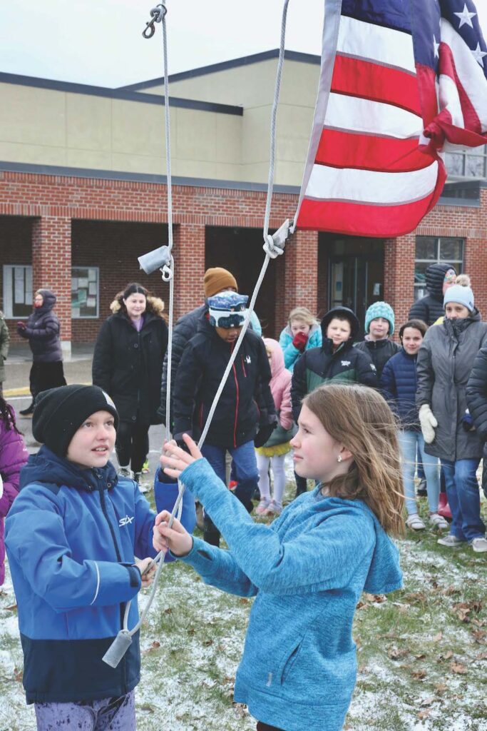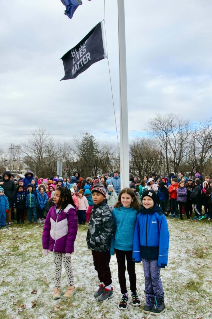 - STUDENTS AND STAFF at Middlebury’s Mary Hogan Elementary School admire the Black Lives Matter flag that was hoisted up the flagpole along with the Stars and Stripes and the Vermont state flag on Thursday, Jan. 4. Independent photo/Steve James