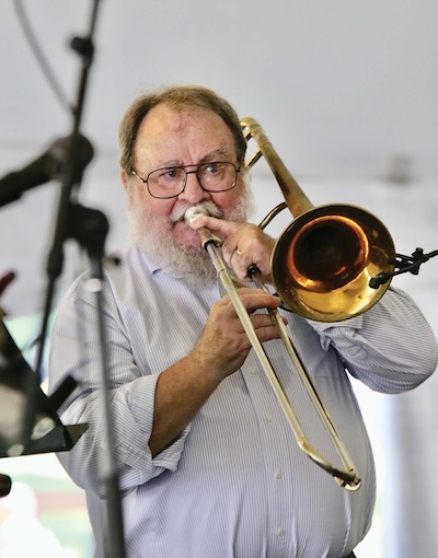 - Trombonist Bear Irwin contributes some brass to the Middlebury Community Music Center faculty performance during lunch on Tuesday. Independent photo/Steve James