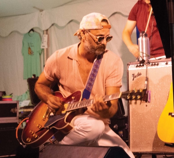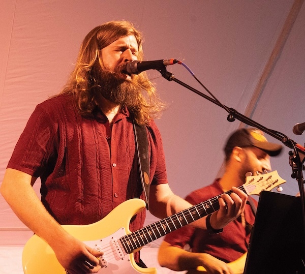 - Madaila founder Mark Daly crouches for a guitar solo during Festival on the Green. Independent photo/John S. McCright
