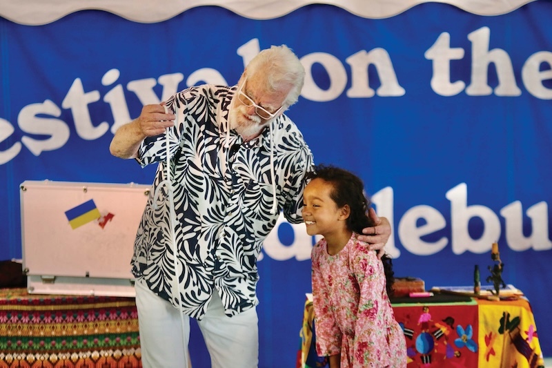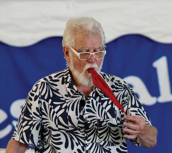- MAGICIAN TOM VERNER and his mime partner “Miss La Fleur” (aka his spouse, noted artist Janet Fredericks), regale the crowd during the Thursday, July 17, Brown Bag Lunch at Middlebury’s Festival on the Green. Verner and Fredericks, who live in Lincoln, are also noted for their considerable contributions through Magicians Without Borders. Independent photo/Steve James