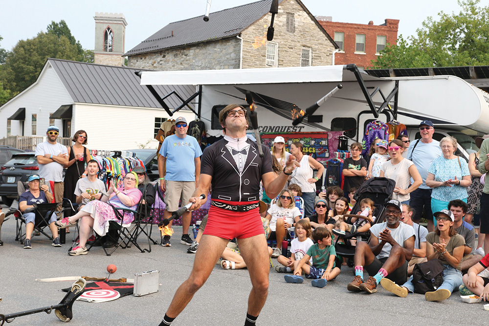 - Agent Honeymoon of the comedy troupe Her Majesty’s Secret Circus plays with fire at Foodaroo 2025. Independent photo/Steve James