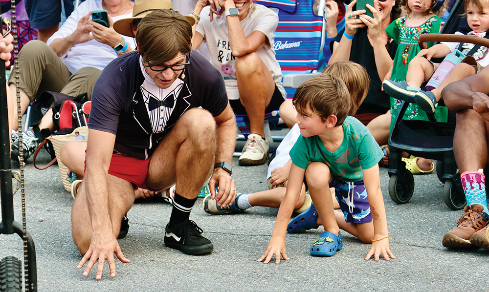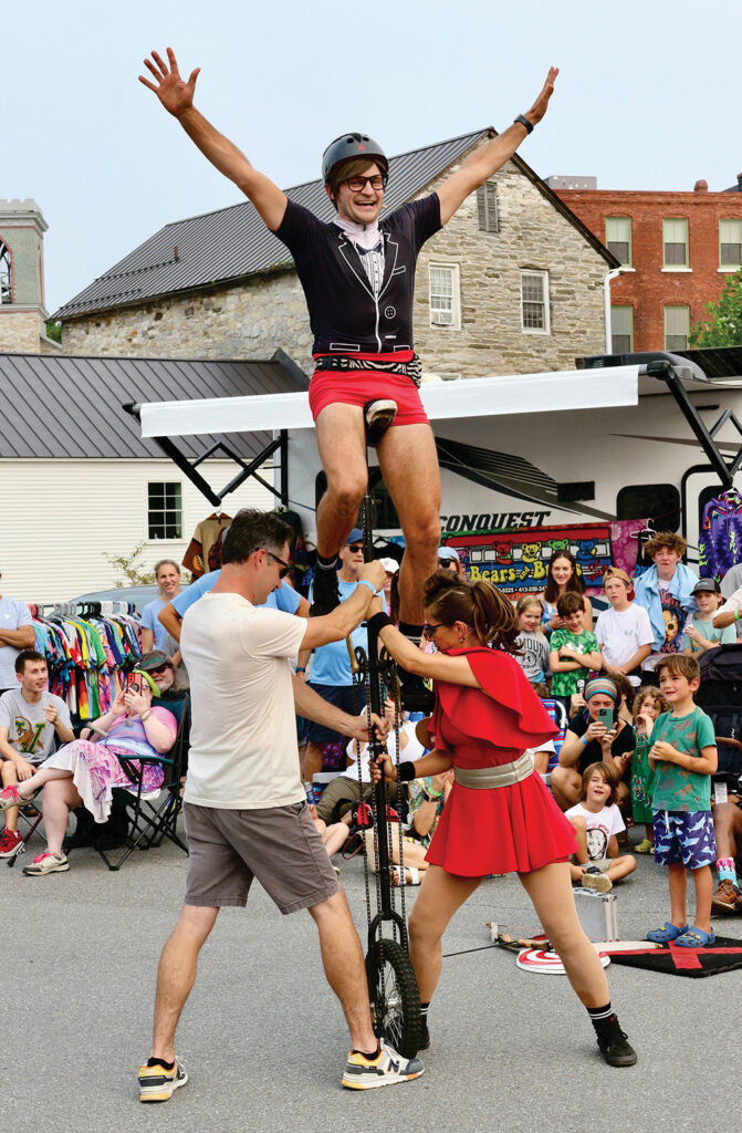 - Josh Leatherwood of Salisbury, left, comes out of the crowd at Sunday’s Foodaroo in Middlebury to help “Agent Butterfly” of the comedy juggling duo Her Majesty’s Secret Circus get her partner, “Agent Honeymoon,” up on a 7-foot unicycle. Laughter and ooo’s of amazement followed. Independent photo/Steve James