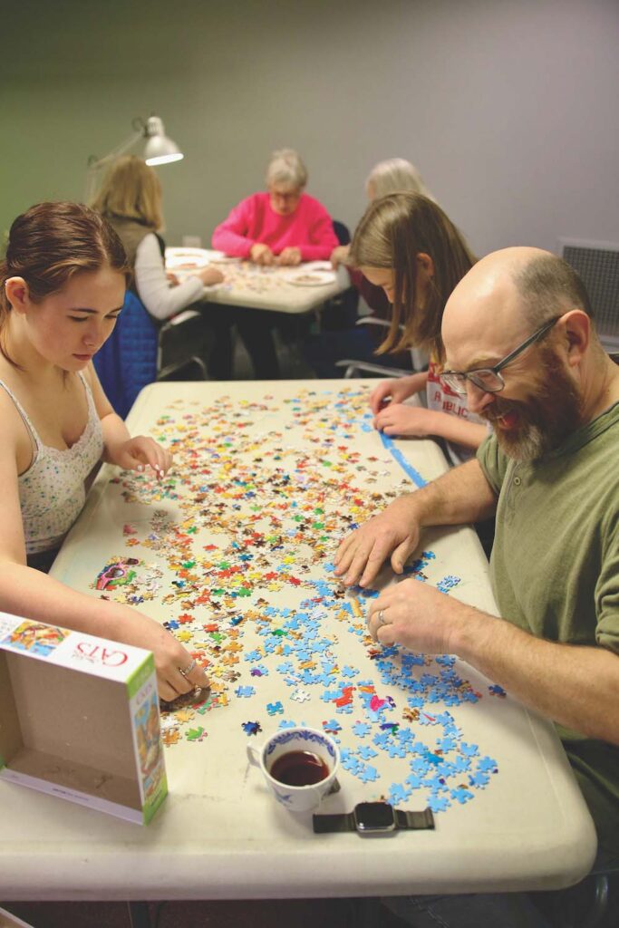 - MIDDLEBURY SELECTMAN ANDY Hooper, right, takes his civic duty seriously by chairing the team “The Missing Piece” at Ilsley Library’s Great Puzzle Challenge this past Saturday morning. His teammates are daughter Bea Hooper, an MUHS junior, and stepson Cullen Myers, a freshman at the high school. Independent photo/Steve James