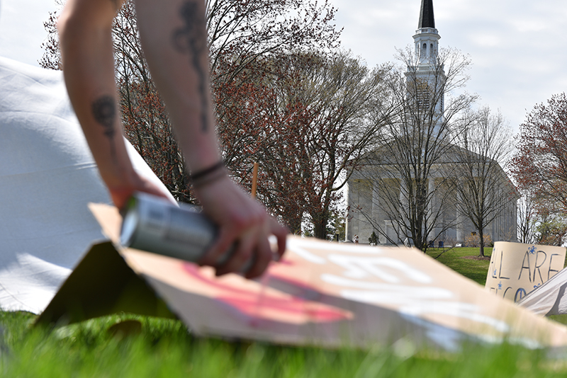- A Middlebury College student spray-paints a pro-divestment message on a sign at the Gaza Solidarity Encampment on McCullough Lawn in sight of Middlebury Chapel. Photo by Charlie Deichman-Caswell, Middlebury College class of 2024