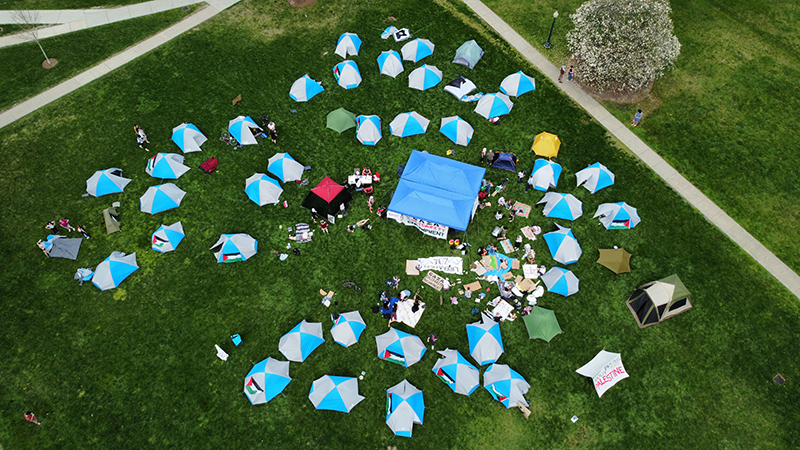 - A group of Middlebury College students put up a Gaza Solidarity Encampment on McCullough Lawn Sunday morning to show solidarity with people in Palestine. Like students at many American institutions of higher education, the Middlebury students want their college to divest of investments that support Israel as it holds Palestinians under siege in the Gaza Strip. The Israeli military launched the siege after Hamas launched attacks on Israel this past Oct. 7. Photo by Charlie Deichman-Caswell, Middlebury College class of 2024