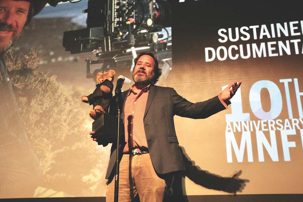 - ANDY MITCHELL ACCEPTS a special tribute from the Middlebury New Filmmakers Festival for his sustained body of excellent documentary films. On stage at Town Hall Theater Sunday, the Middlebury resident accepted the award for the skill, sensitivity and boldness he has demonstrated while shooting diverse subjects which are often in dangerous environments. Independent photo/Steve James