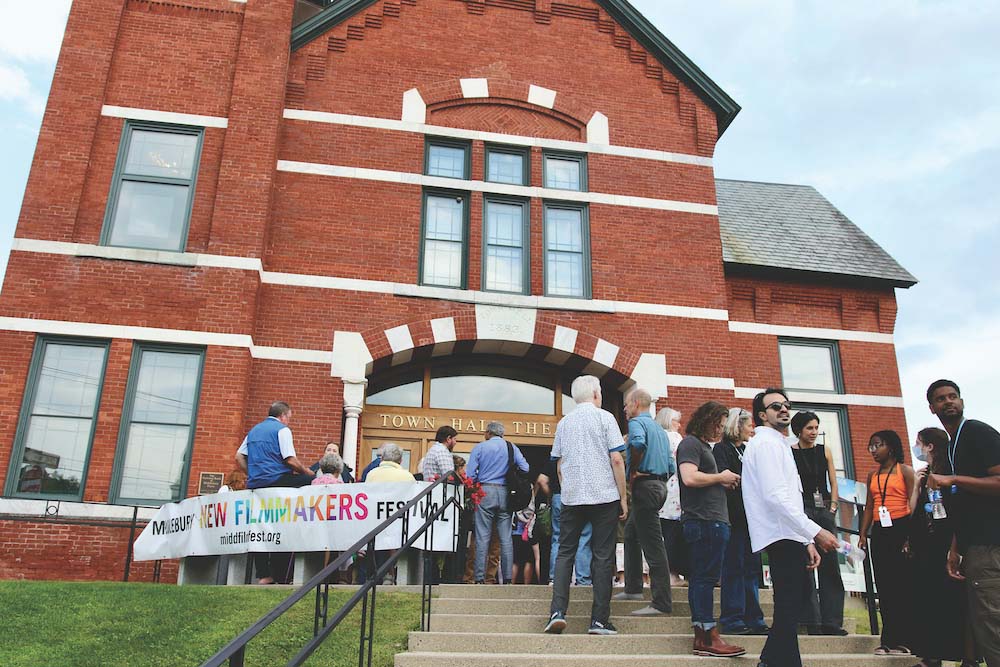 - FILM ENTHUSIASTS GATHER outside Town Hall Theater Sunday morning after the screening of Bess O’Brien’s “Just Getting By.” Independent photo/Steve James
