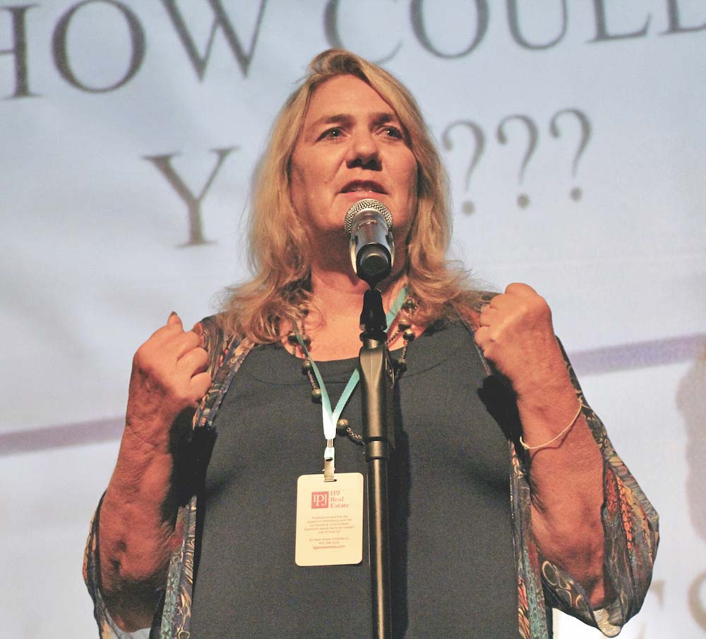 - KAREN AKINS, OF Stowe, winner of the Gaia Prize for Environmental Filmmaking for her documentary “The Quietest Year,” speaks on stage Sunday. Independent photo/Steve James