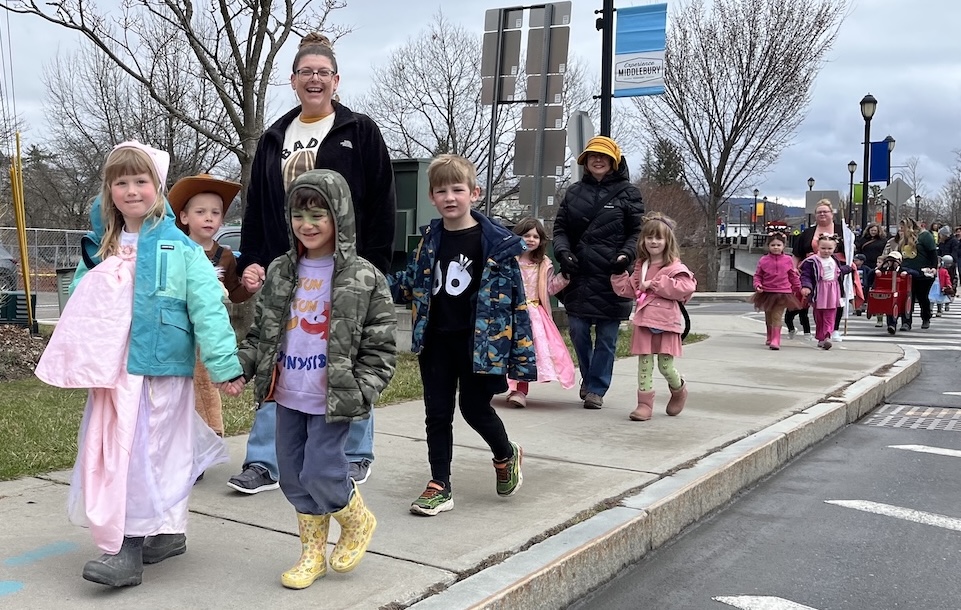 - PRESCHOOLERS FROM MARY Johnson Children’s Center march across the Cross Street Bridge into downtown Middlebury this past Friday dressed as their favorite book characters. It was part of the center’s celebration of the Week of the Young Child. Independent photo / Christy Lynn