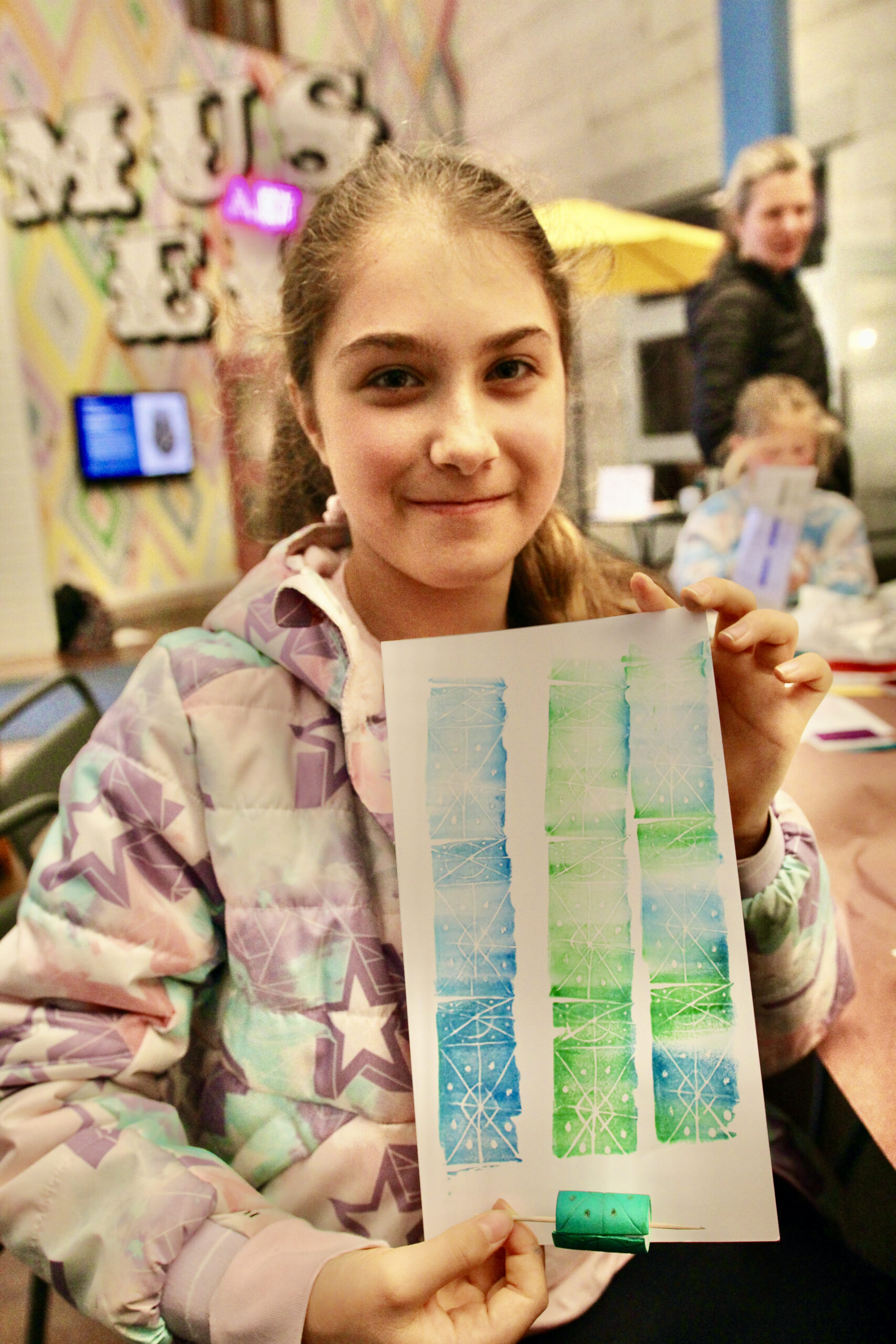 Nehir Cobb, 11, visiting from Rutland, displays her printing effort_