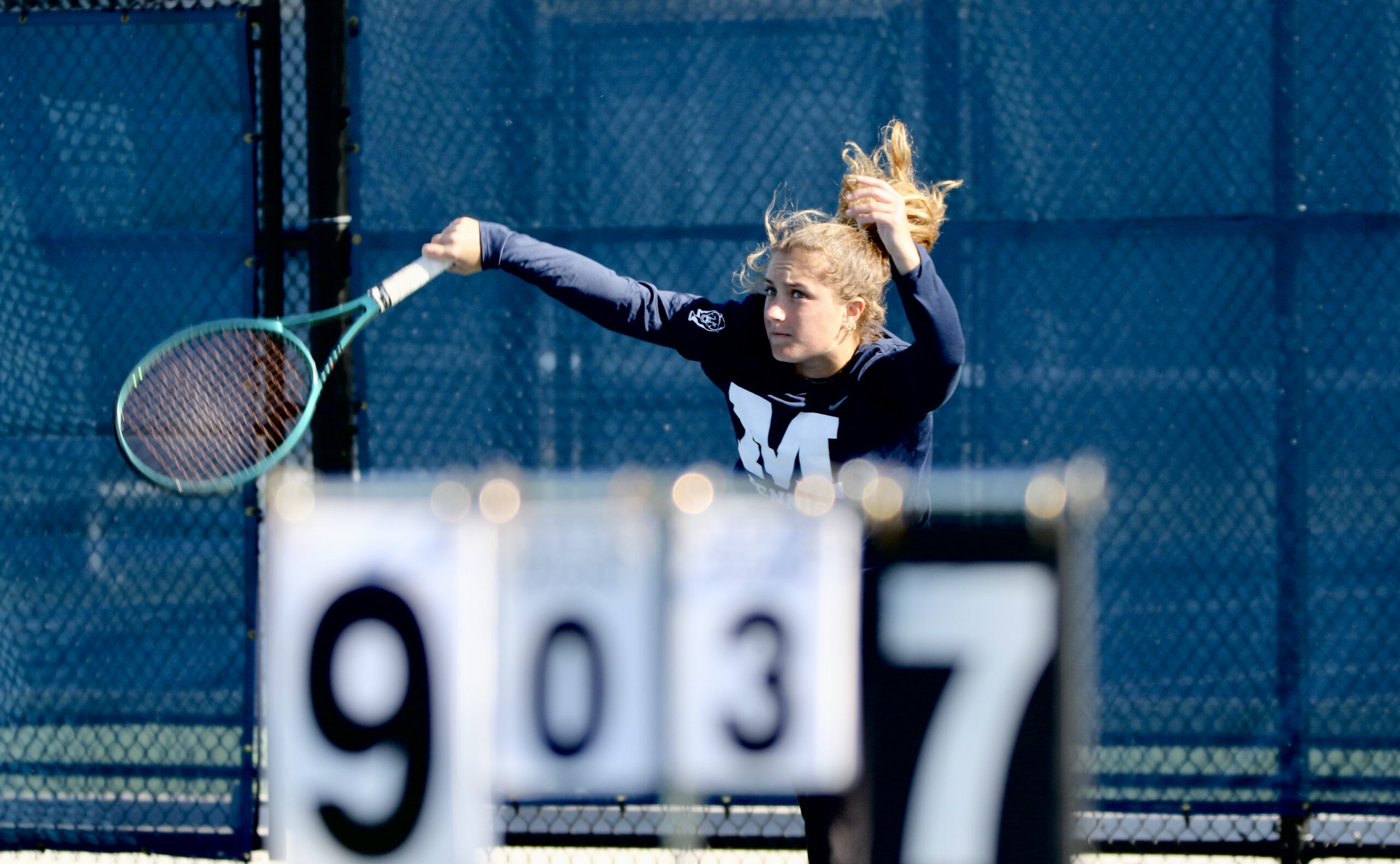 COMING OF VICTORIES against opponents from Amherst and Hamilton this past weekend, Middlebury College sophomore Elizabeth Doak on Tuesday practices her serve. She is 10-1 going into this coming weekend’s tennis competitions at Colby and Bowdoin. Independent photo/Steve James