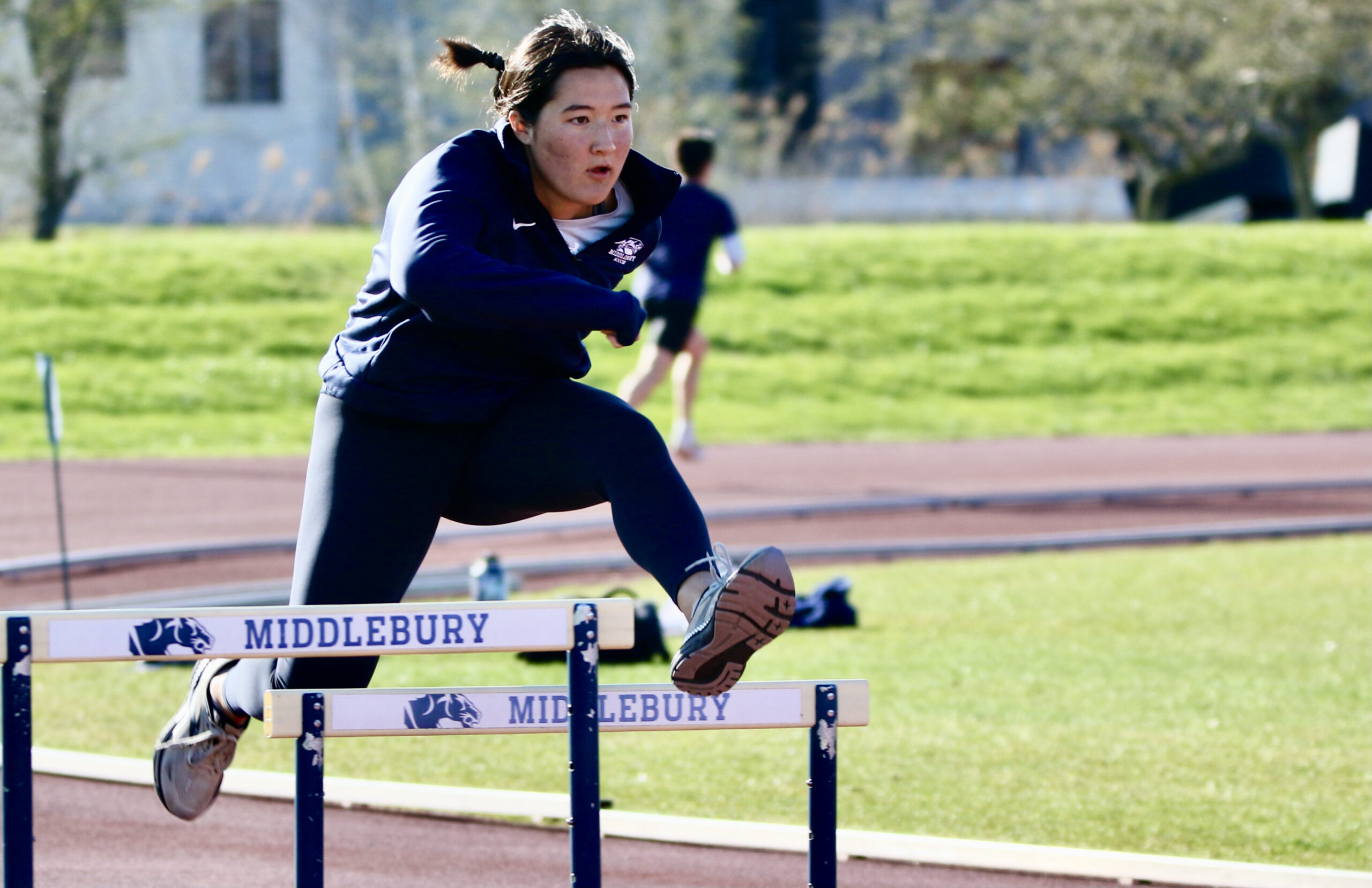 MIDDLEBURY COLLEGE TRACK and field athletes returned to Dragone Field this week after hosting their namesake invitational on Saturday, where the men’s team won eight event and the women tallied 14 event victories, including a sweep of the field events. Shown at practice on Tuesday is first year hurdler Lauren Tracey, who was third in Saturday’s 400m hurdles race. The Panthers are preparing for the NESCAC Championship Meet at Williams College on April 25 and 26.